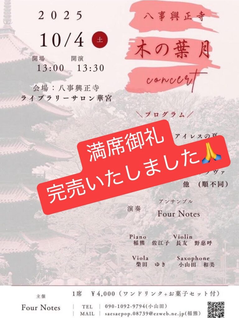秋を感じる曲をたくさん取り揃えました、木の葉月コンサート🎷🎻🎻🎹🎵