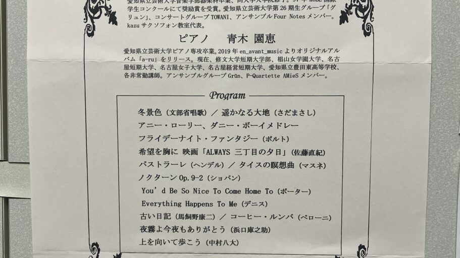 今回の曲目は、色々なジャンルの曲を少しずつお楽しみいただく、音楽のアラカルト🎵